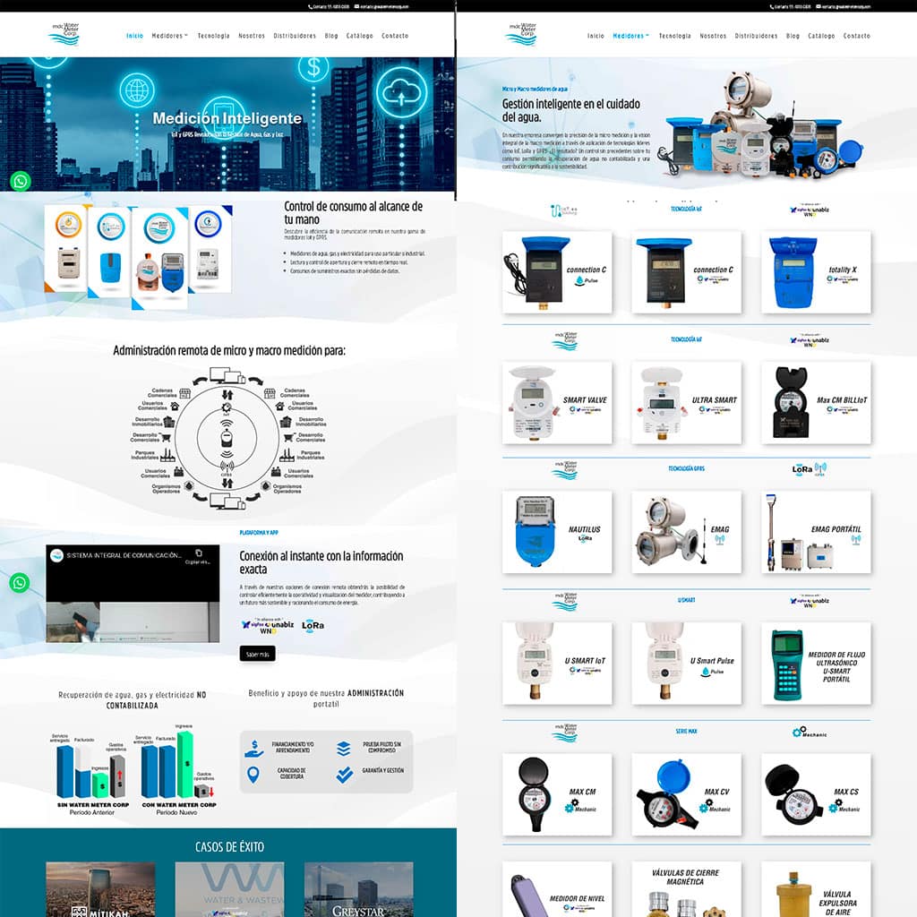 El Desafío: Estructurar una plataforma web robusta para una empresa líder en medición de agua, que requería la integración de un catálogo extenso y contenido técnico especializado. El objetivo era proyectar una imagen de alta tecnología y confianza, facilitando el acceso a la información técnica para ingenieros y tomadores de decisiones.