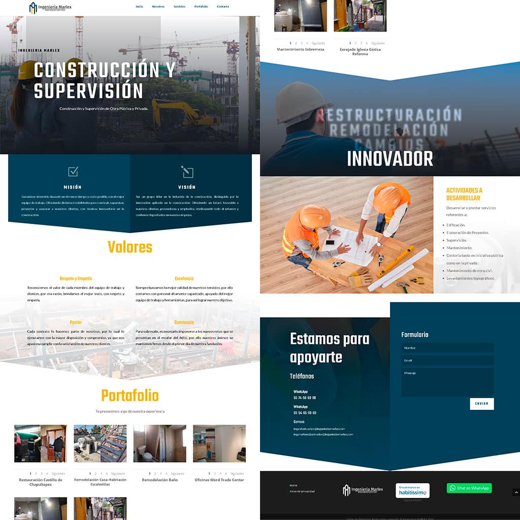 Portafolio de Obras de Alto Impacto: Implementamos una sección de portafolio técnica y visualmente atractiva, donde se detallan los proyectos ejecutados, reforzando la autoridad de Marlex en el sector de la construcción.